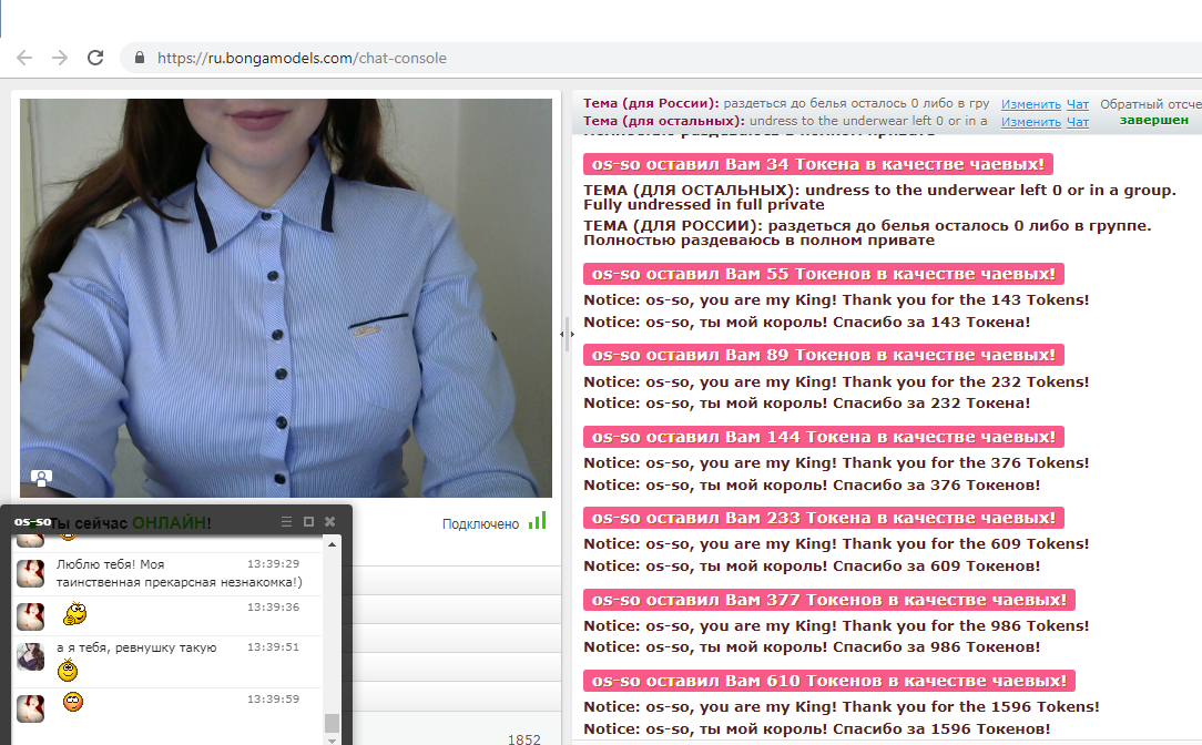 Premendo il tasto, farai sì che la modella -oOo- raggiunga per 60 secondi la prima posizione nella pagina principale. Durante questo periodo, la chat room della modella diventerà più visibile e incredibilmente popolare! Una notifica in merito alla tua azione apparirà all’interno della chat, visibile alla modella e a tutti gli altri utenti della chat. -oOo- apprezzerà certamente questo gesto e te ne sarà immensamente grata!