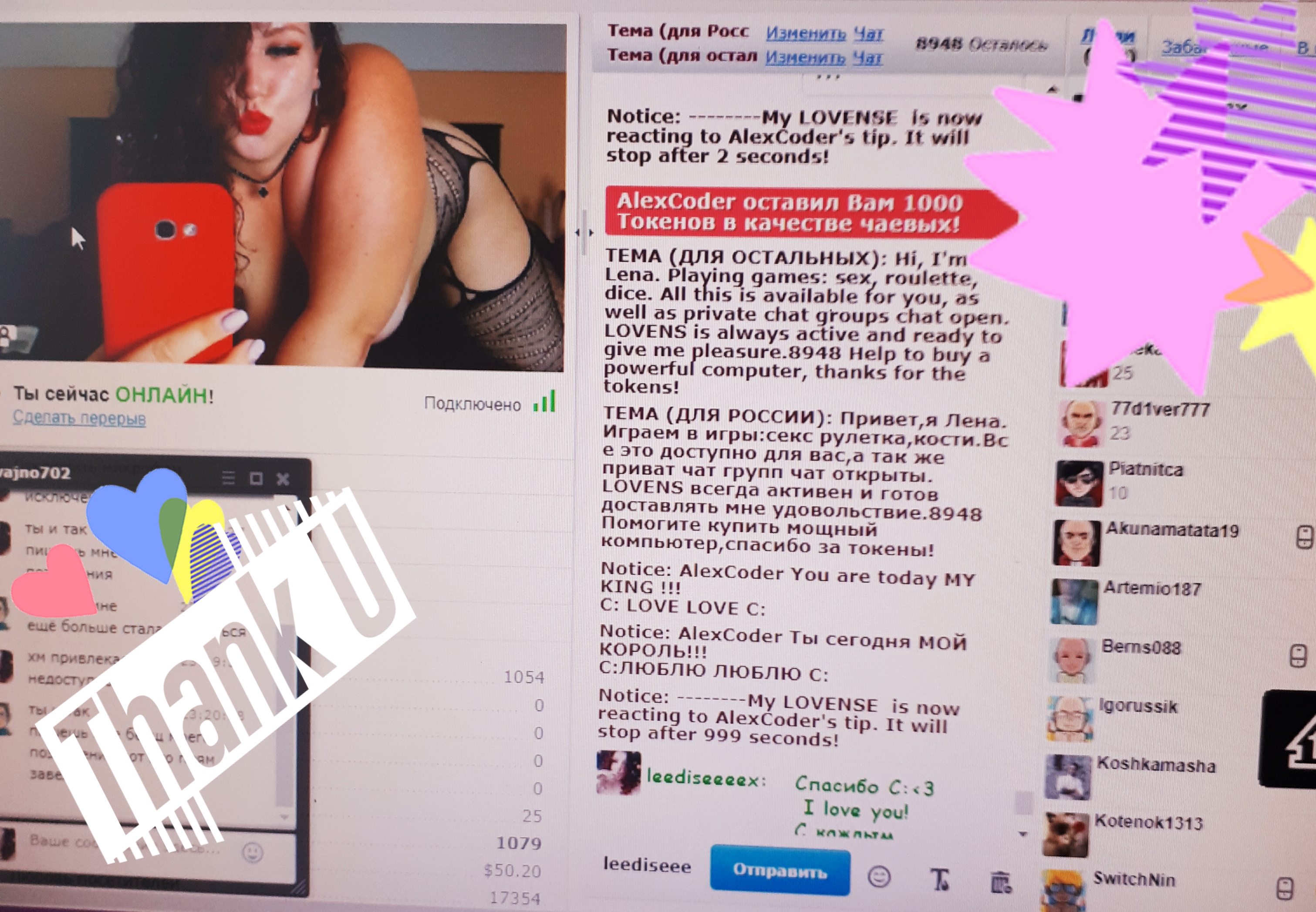 Premendo il tasto, farai sì che la modella leediseeeex raggiunga per 60 secondi la prima posizione nella pagina principale. Durante questo periodo, la chat room della modella diventerà più visibile e incredibilmente popolare! Una notifica in merito alla tua azione apparirà all’interno della chat, visibile alla modella e a tutti gli altri utenti della chat. leediseeeex apprezzerà certamente questo gesto e te ne sarà immensamente grata!